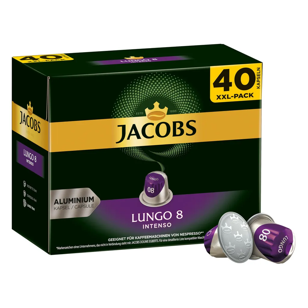 Schreibe die erste Rezension für „Jacobs Lungo 8 Intenso XXL-Pack | 40 Nespresso® Komp. Kapseln“ Antwort abbrechen
