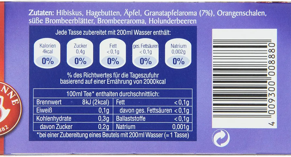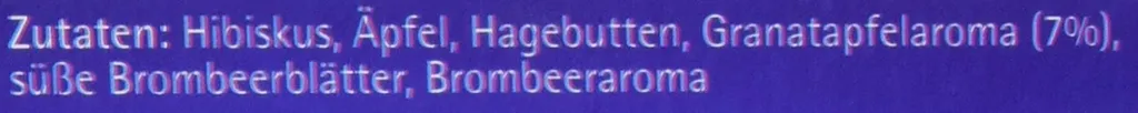 Zutaten Hibiskus, Aepfel, Hagebutten, Granatapfelaroma (7%), suesse Brombeerblaetter, Brombeeraroma